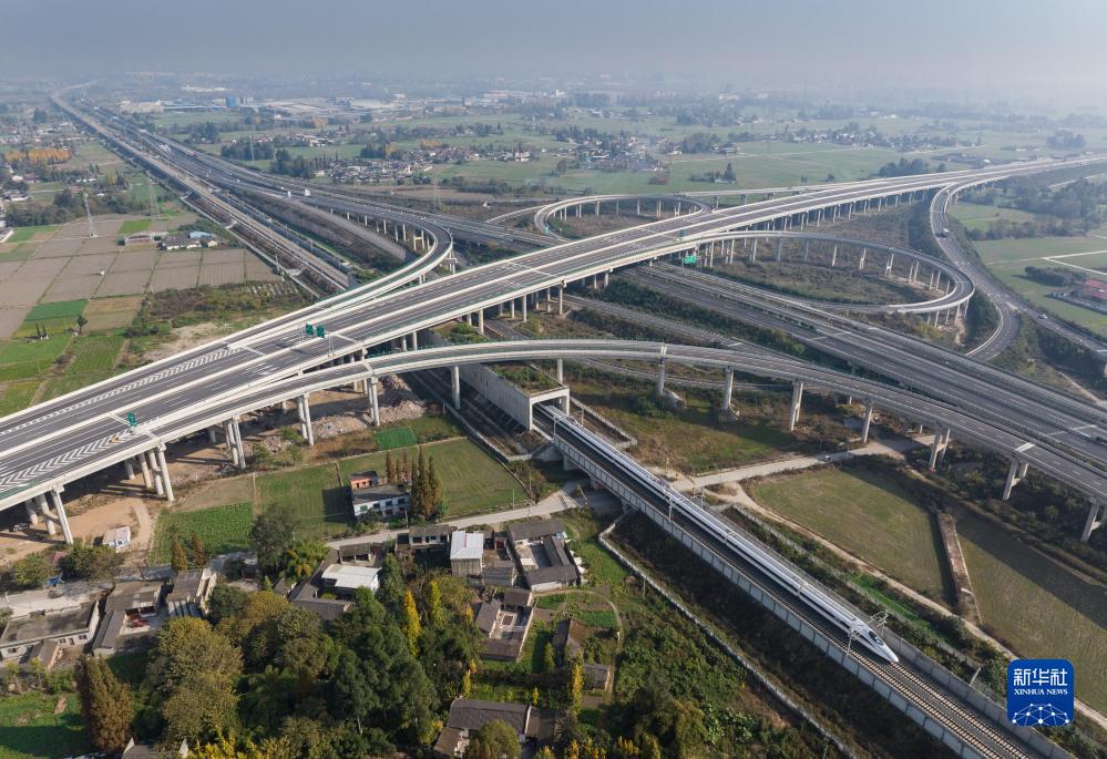 11月28日,首發(fā)列車C6008次列車行駛在川青鐵路上,該段與成萬(wàn)高速并行、與成都都市圈環(huán)線高速交會(huì)(無(wú)人機(jī)照片)。新華社記者 江宏景 攝