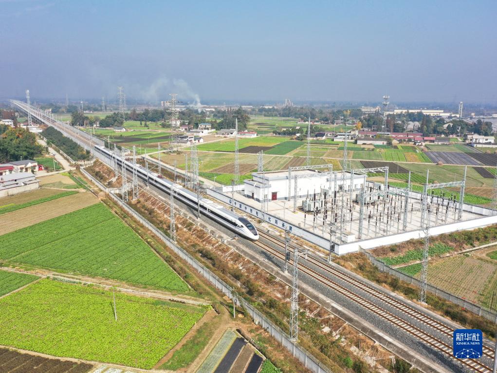 列車??吭诖ㄇ噼F路鎮(zhèn)江關(guān)站,該站毗鄰岷江,站臺(tái)跨越317國(guó)道(11月13日攝,無(wú)人機(jī)照片)。新華社記者 江宏景 攝