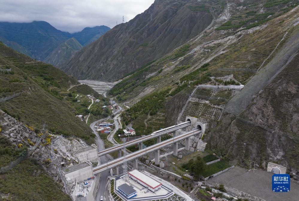 調(diào)試列車駛?cè)氪ㄇ噼F路茂縣站(10月13日攝,無(wú)人機(jī)照片)。新華社記者 王曦 攝