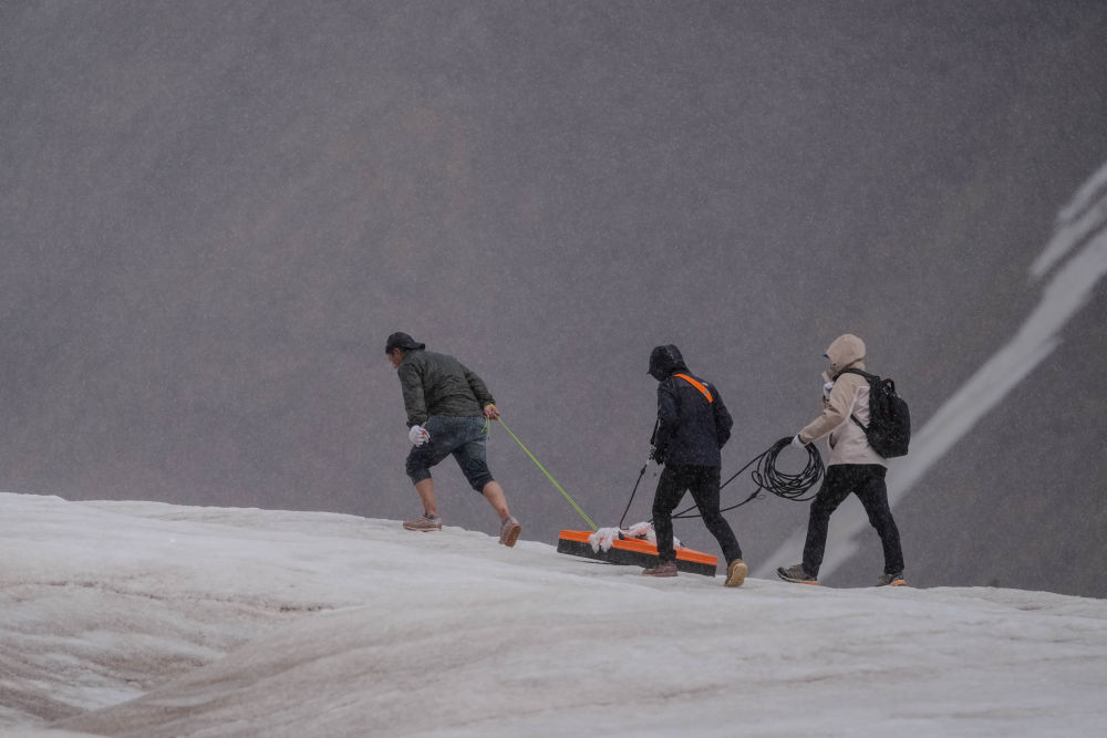 科考隊員在冬克瑪?shù)妆ㄉ鲜占瘶悠罚?024年7月25日攝)。新華社 杜笑微 攝