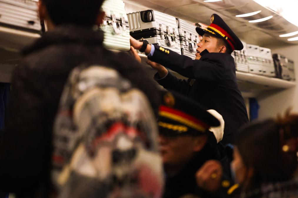 列車長張彥良(右上)幫助務(wù)工人員整理行李。(中國鐵路青藏集團有限公司供圖)