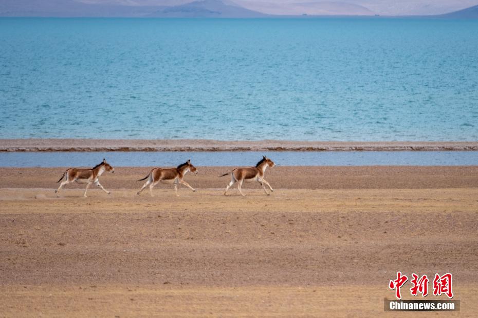 圖為5月2日,西藏色林錯(cuò)湖邊三頭藏野驢在撒歡奔跑。江飛波 攝