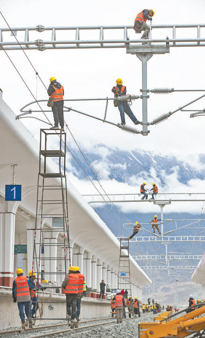 4月1日,中鐵電氣化局集團技術(shù)工人在林芝火車站進(jìn)行接觸網(wǎng)精調(diào)作業(yè)。焦宏濤攝(新華社發(fā))