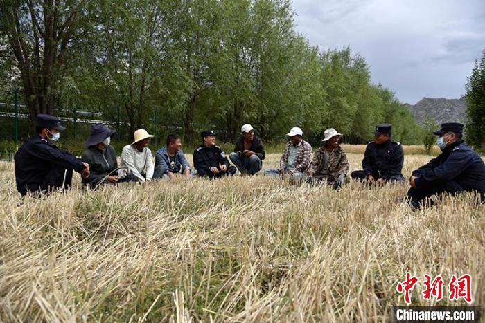 一陣忙碌過(guò)后,大家圍攏在田里聊變化說(shuō)發(fā)展。慶祝西藏和平解放70周年大會(huì)剛剛舉行,大家聊著現(xiàn)場(chǎng)觀禮、收聽(tīng)收看的感受。參加現(xiàn)場(chǎng)大會(huì)的民警高揚(yáng)向大家分享現(xiàn)場(chǎng)感受,講述自己在西藏生活學(xué)習(xí)工作22年的發(fā)展變化和入警初心。歡聲笑語(yǔ)過(guò)后,大家又忙碌起來(lái)。田間地頭藏青藍(lán)的身影,與金黃麥地構(gòu)成一幅加強(qiáng)民族團(tuán)結(jié)、警民魚(yú)水情深的動(dòng)人畫卷。