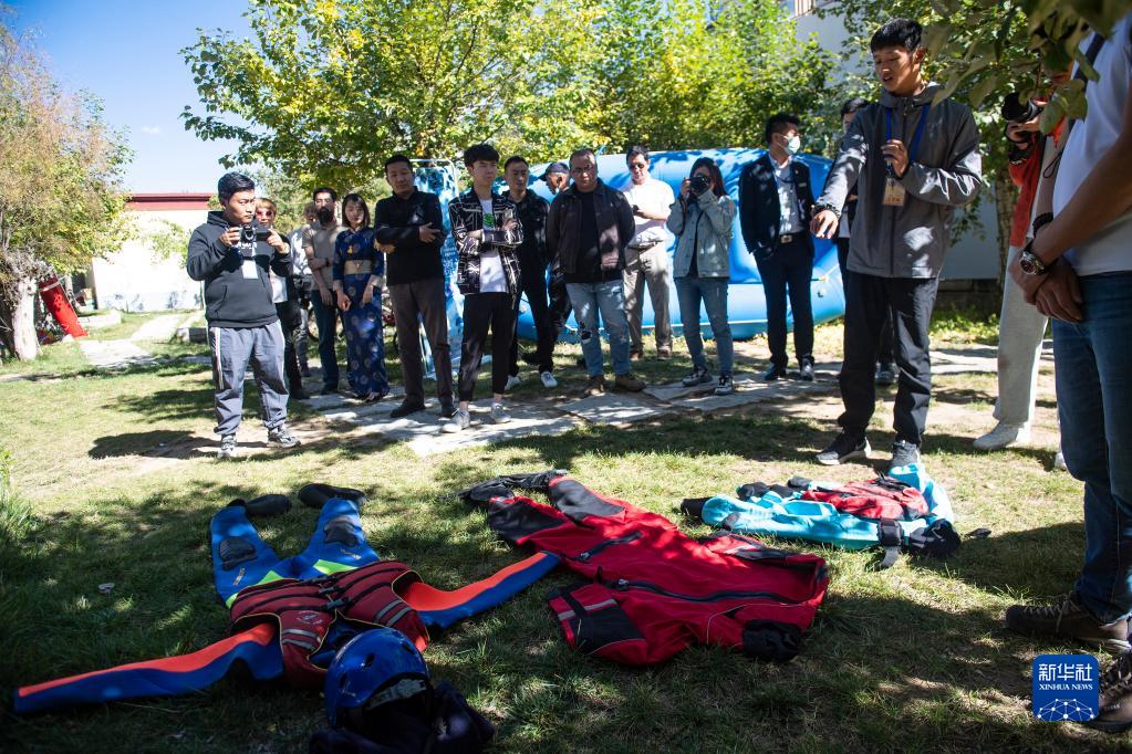 9月30日,一名工作人員在西藏旅游新業(yè)態(tài)分享會上介紹漂流項目中使用的救生裝備。新華社記者 孫瑞博 攝