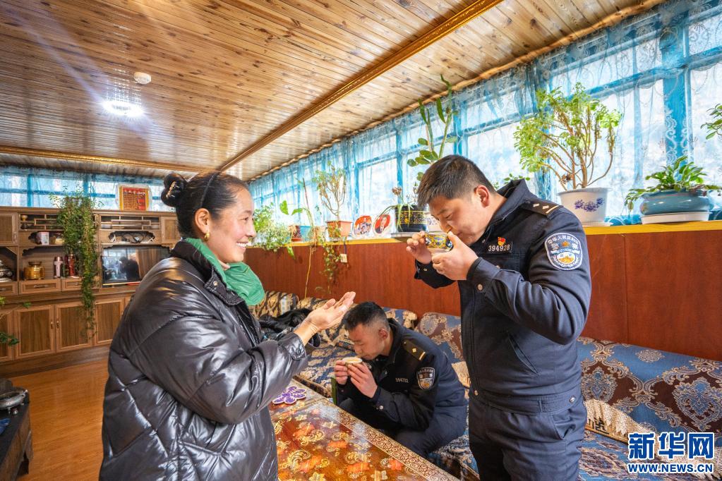 民警幫轄區(qū)群眾劈完柴火后,群眾請民警喝一杯酥油茶(12月7日攝)。新華社發(fā) (晴雯、彭維熙、劉戀報(bào)道)