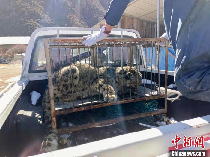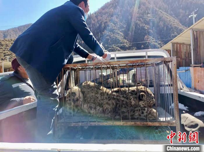 圖為工作人員將雪豹運(yùn)送至林芝市野生動物收容救護(hù)站。 林芝市林草局供圖