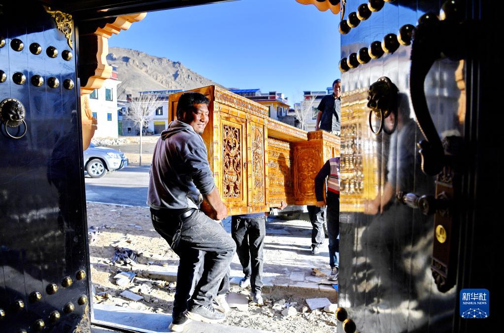 次旺堅參(左)將家具搬進位于湘河水庫移民新村的新家(3月27日攝)。新華社記者 張汝鋒 攝