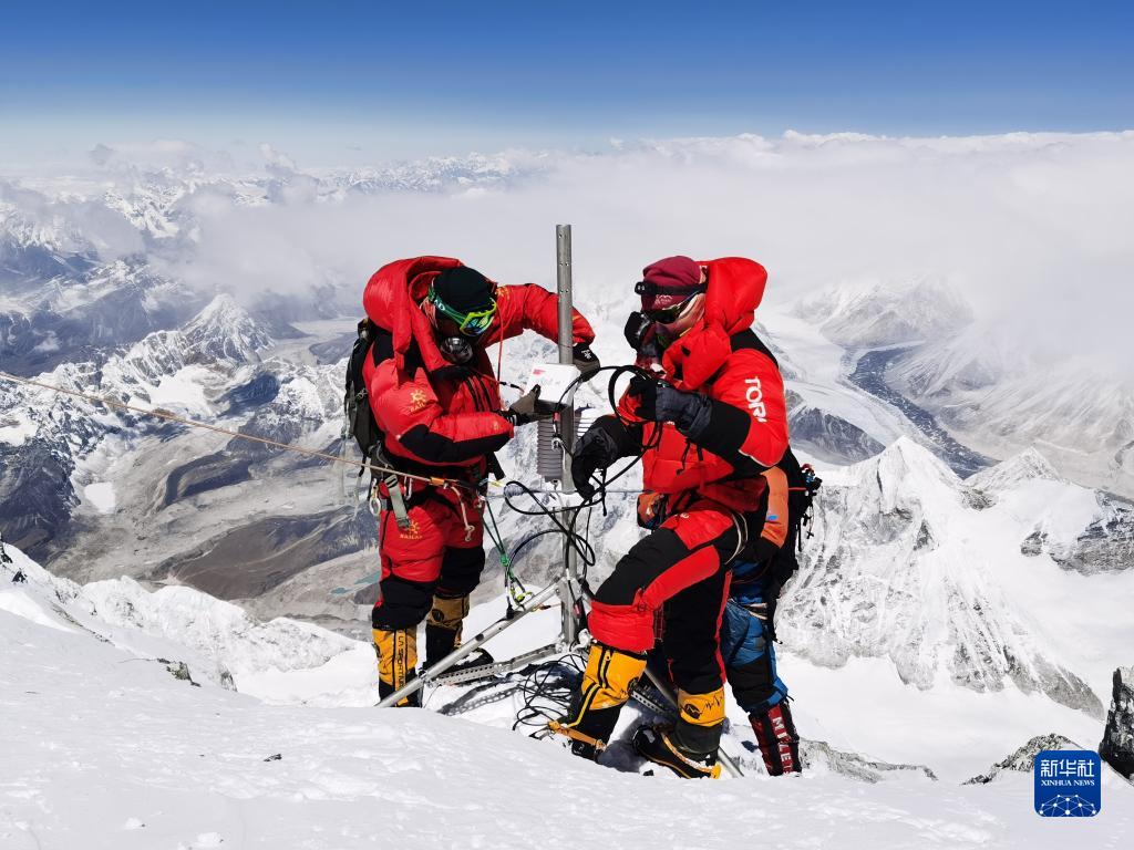 在珠穆朗瑪峰峰頂,科考隊(duì)員展示第二次青藏高原綜合科學(xué)考察研究旗幟。