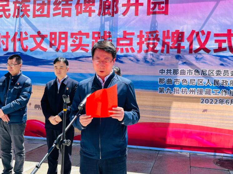 為鑄牢中華民族共同體意識,助力色尼區(qū)新時代文明實(shí)踐和創(chuàng)建全國民族團(tuán)結(jié)進(jìn)步模范區(qū)創(chuàng)建工作,6月11日,由杭州援藏工作組組織修建完成的西藏首個民族團(tuán)結(jié)碑廊在西藏自治區(qū)那曲市色尼區(qū)正式開園。那曲市政府黨組成員、副市長,色尼區(qū)委書記李東出席儀式,色尼區(qū)有關(guān)單位民族團(tuán)結(jié)創(chuàng)建工作專干、新時代文明實(shí)踐中心志愿者以及僧尼群眾代表60余人參加儀式?! ?/p>
