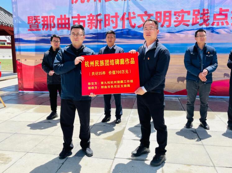 儀式上,那曲市委宣傳部決定將杭州民族團(tuán)結(jié)碑廊設(shè)為那曲市新時代文明實(shí)踐點(diǎn),并進(jìn)行授牌。杭州援藏工作組向色尼區(qū)捐贈價值700萬元的杭州民族團(tuán)結(jié)碑廊書法作品。