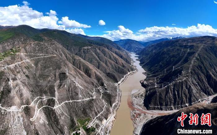 蘇洼龍水電站500千伏送出工程(中)與川藏聯網鏈路(兩側)并行跨越金沙江大峽谷。 劉湘釩 攝