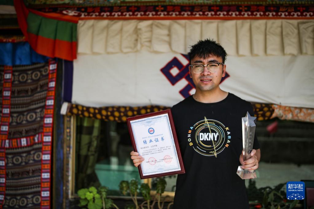 “格桑花開”大學(xué)生就業(yè)創(chuàng)業(yè)特訓(xùn)營(yíng)學(xué)員、江蘇今世緣酒業(yè)股份有限公司甘青藏大區(qū)業(yè)務(wù)經(jīng)理土旦平措展示特訓(xùn)營(yíng)結(jié)業(yè)證書和“區(qū)外就業(yè)之星”獎(jiǎng)杯(2022年6月23日攝)。新華社記者 姜帆 攝