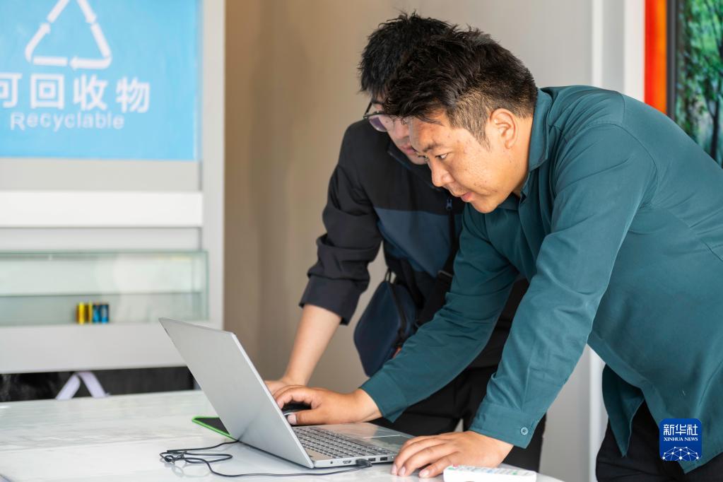 “格?;ㄩ_”大學(xué)生就業(yè)創(chuàng)業(yè)特訓(xùn)營(yíng)學(xué)員、西藏墨竹工卡格?;ㄩ_大學(xué)生創(chuàng)業(yè)管理有限公司創(chuàng)辦人頓珠次仁(右)在墨竹工卡縣生活垃圾分類宣教中心講解垃圾分類常識(shí)(2022年6月23日攝)。新華社記者 周荻瀟 攝