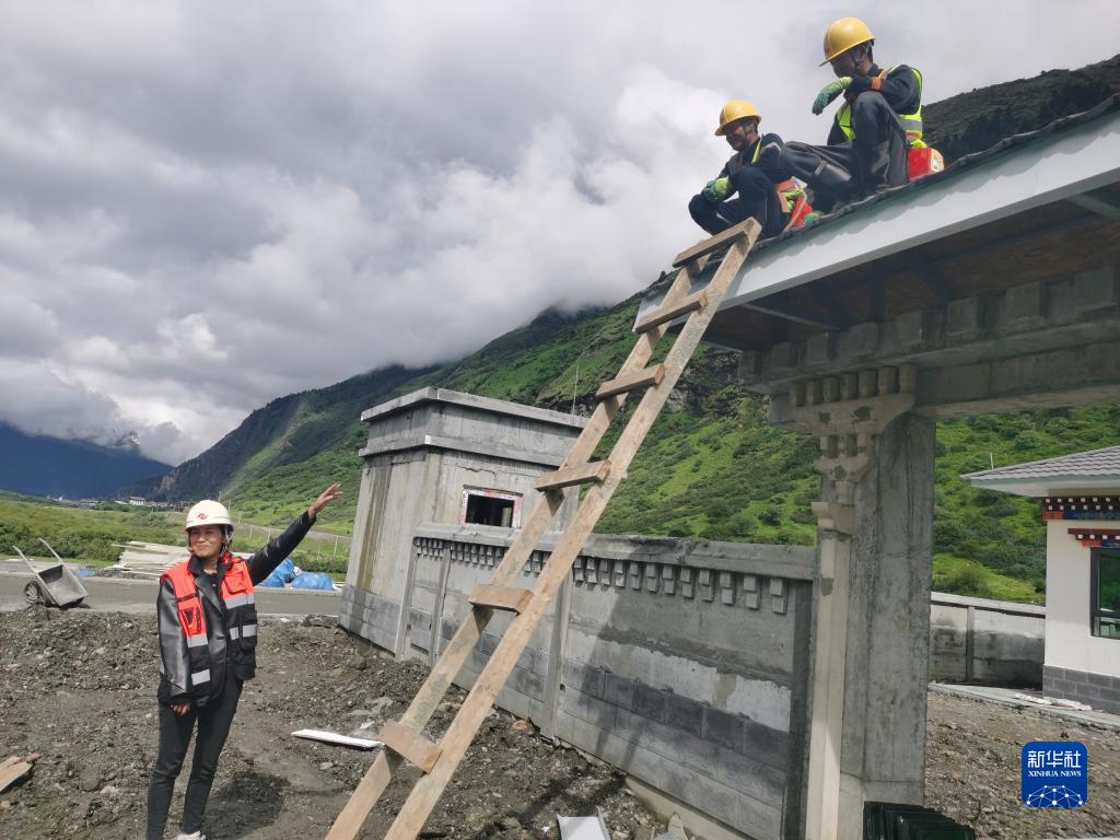 “格?;ㄩ_”大學(xué)生就業(yè)創(chuàng)業(yè)特訓(xùn)營(yíng)學(xué)員、西藏藏建科技股份有限公司職員阿吉卓瑪(左)在施工現(xiàn)場(chǎng)工作(2022年6月28日攝)。