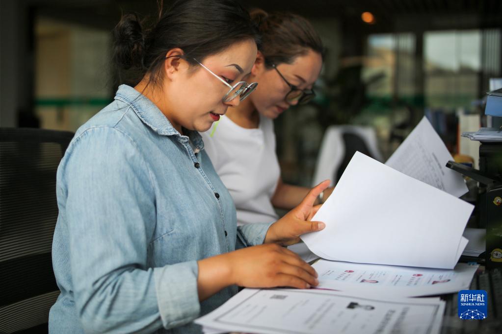“格?;ㄩ_”大學(xué)生就業(yè)創(chuàng)業(yè)特訓(xùn)營(yíng)學(xué)員、西藏藏建科技股份有限公司職員次仁瓊達(dá)(左)在工作(2022年6月24日攝)。新華社記者 姜帆 攝