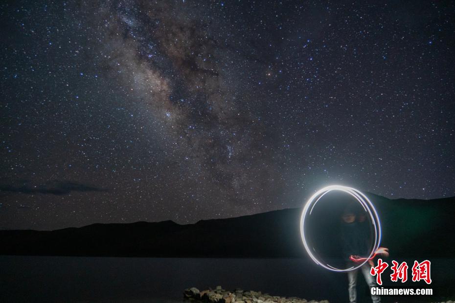 7月17日晚,游客在西藏羊卓雍錯湖畔進行光繪攝影,遠處便是浩瀚銀河。江飛波 攝