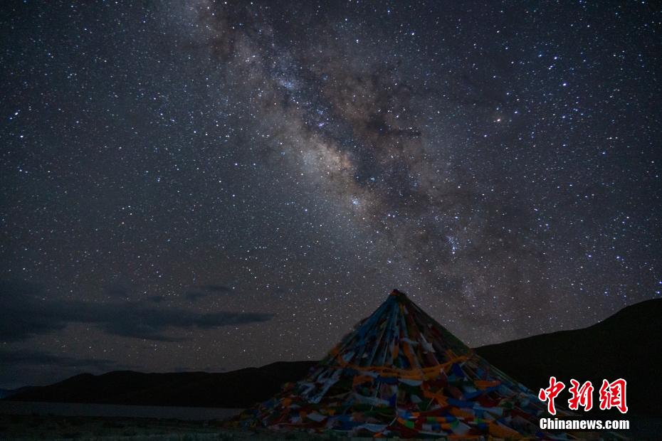 西藏羊卓雍錯湖畔的經(jīng)幡與銀河。江飛波 攝