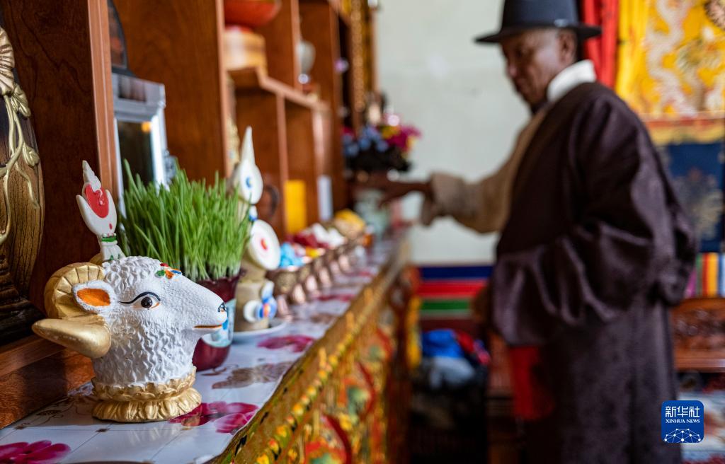 2月20日,在位于西藏拉薩市墨竹工卡縣門(mén)巴鄉(xiāng)的家中,扎西次仁用五彩青稞穗裝點(diǎn)象征吉祥的“切瑪”。新華社記者 孫非 攝