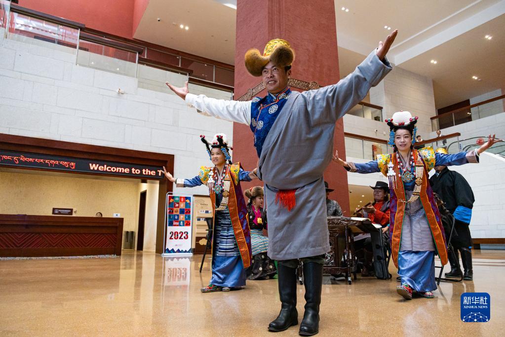 2月22日,在西藏博物館,“堆諧”舞蹈演員向觀眾謝幕。新華社發(fā)(丁增尼達(dá) 攝)