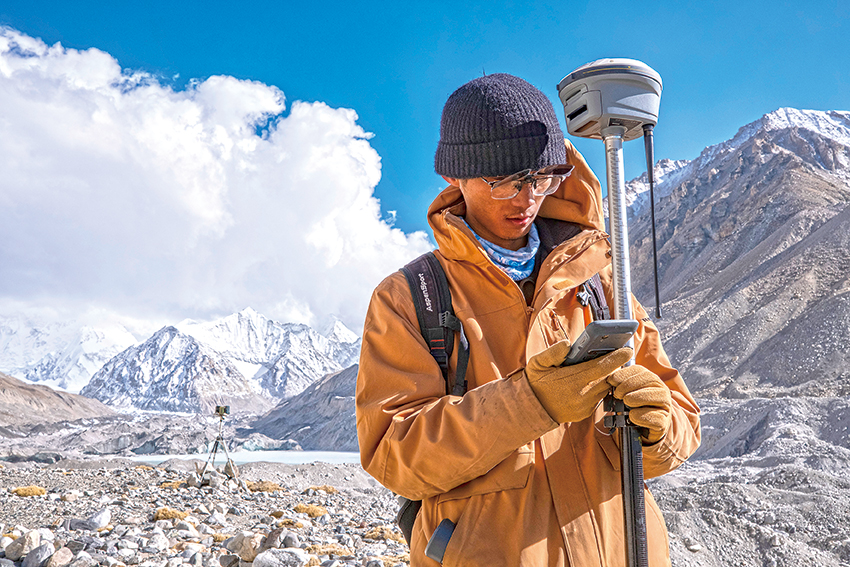 來自中國科學(xué)院西北生態(tài)環(huán)境資源研究院的科考隊員薛雨昂在對冰川進(jìn)行實時差分GPS定位(5月15日攝)。新華社記者晉美多吉攝