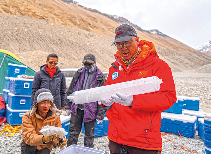 在珠峰登山大本營,中國科學(xué)院西北生態(tài)環(huán)境資源研究院副院長康世昌(右)在查看從珠峰海拔約6500米處鉆取的冰芯樣品(5月22日攝)。新華社記者孫非攝