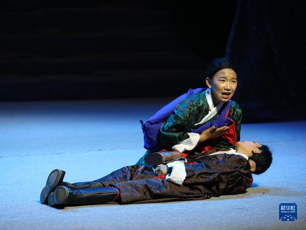 13歲的小演員旦增夢朗身著深綠色藏戲服飾,跪在舞臺中央,眼角噙淚,緊摟著失去意識的弟弟……低沉、哀慟的藏戲唱腔,舞臺兩側(cè)實時滾動的字幕,看哭了不少觀看試演的觀眾。