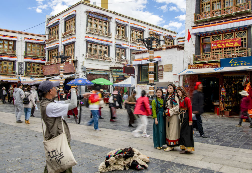 游客身著藏裝在拉薩八廓街拍照留念(6月13日攝)。新華社記者 姜帆 攝
