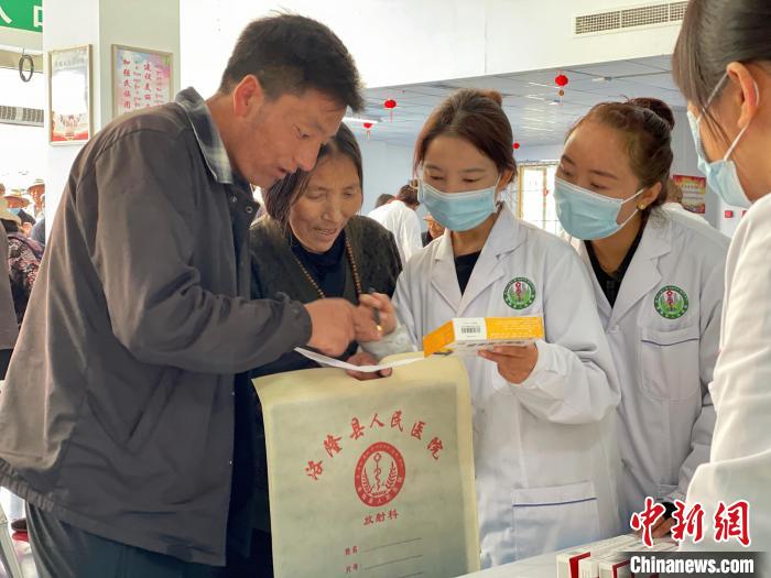 義診當(dāng)日,醫(yī)學(xué)專家分組在洛隆縣人民醫(yī)院和豐收廣場(chǎng)開(kāi)始義診。上午九時(shí)許,來(lái)自縣城周邊的藏族民眾在洛隆縣人民醫(yī)院(以下簡(jiǎn)稱“縣人民醫(yī)院”)門口早早排起了長(zhǎng)隊(duì),平日候診的醫(yī)院大廳早已布置成了臨時(shí)診室,醫(yī)務(wù)志愿者換上白大褂落座開(kāi)始義診。縣人民醫(yī)院為每一位骨科、內(nèi)科、全科、呼吸科、婦科等科室的醫(yī)生配有一名藏族醫(yī)生,協(xié)助北京醫(yī)療專家與當(dāng)?shù)孛癖姕贤ú∏椋瑫r(shí)學(xué)習(xí)診療技術(shù)。