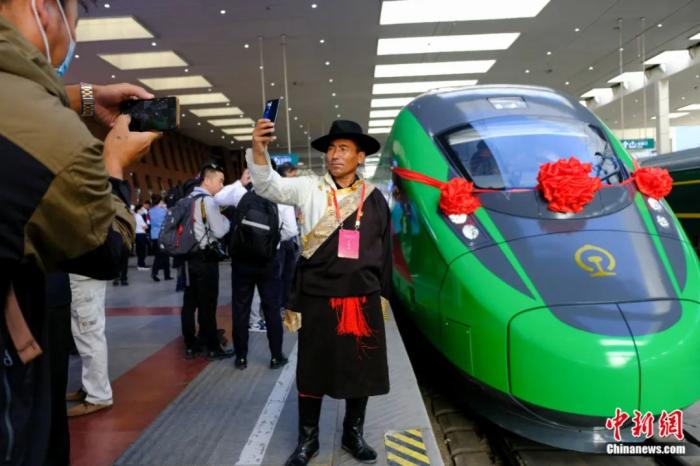 2021年6月25日,川藏鐵路拉林段(拉林鐵路)正式開通運(yùn)營。民眾在拉薩火車站復(fù)興號(hào)車頭前自拍留念。江飛波 攝