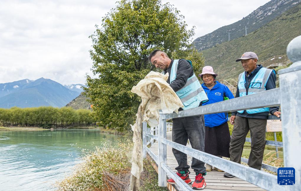 雅尼國家濕地公園管護員普布多杰(左)在巡護途中清理垃圾(9月8日攝)。新華社發(fā)(丁增尼達 攝)