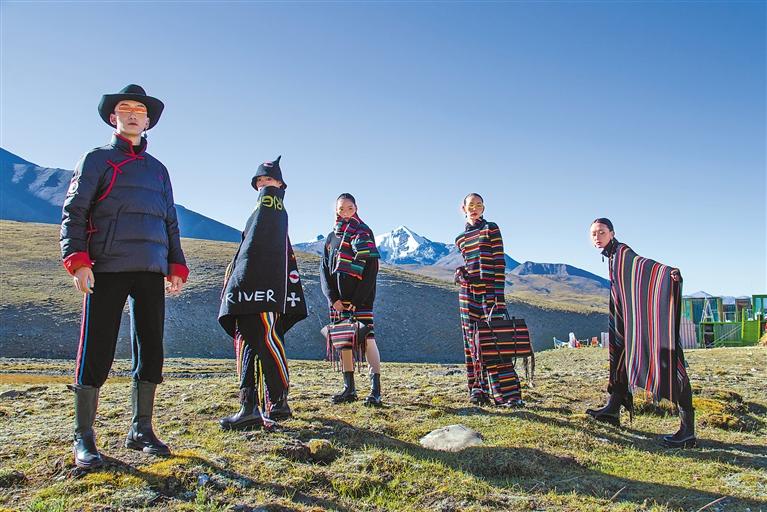 以萬里晴空為幕,以乃欽康桑雪山為背景。隨著富有濃郁藏族風(fēng)情的銅鈴聲響起,模特們身著40套款式各異的創(chuàng)新氆氌工藝服飾,陸續(xù)登場(chǎng),為觀眾呈現(xiàn)了一場(chǎng)震撼心靈的視覺盛宴。