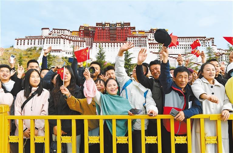 10月1日上午,西藏自治區(qū)慶祝中華人民共和國(guó)成立74周年“升國(guó)旗、唱國(guó)歌”儀式在布達(dá)拉宮廣場(chǎng)舉行。圖為群眾在觀看升旗儀式。記者 次仁平措 攝