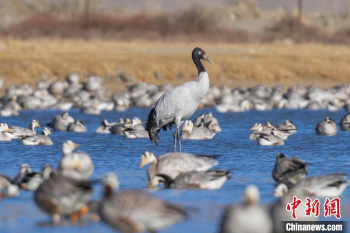圖為在日喀則市拉孜縣越冬的黑頸鶴。盧曉娜 攝