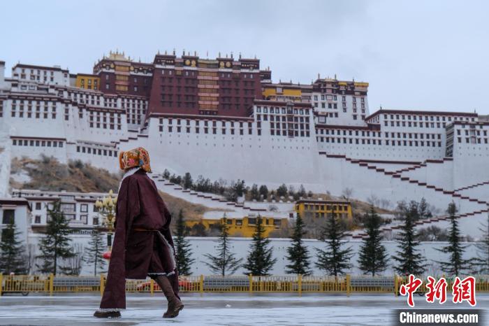1月16日,西藏拉薩迎來(lái)2024年首場(chǎng)降雪,圖為民眾途經(jīng)雪后的布達(dá)拉宮廣場(chǎng)。江飛波 攝