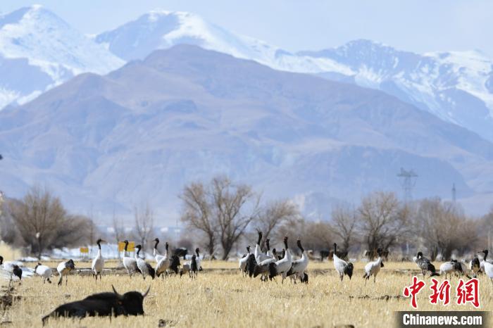 圖為拉薩林周縣黑頸鶴保護(hù)區(qū)內(nèi),黑頸鶴正在覓食、嬉戲。貢嘎來(lái)松 攝