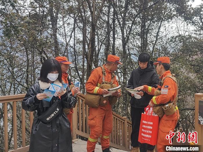 圖為森林消防員為進(jìn)山入林游客發(fā)放防火宣傳手冊。張靖椿 攝