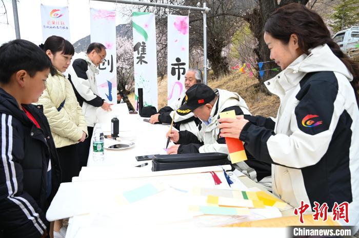 圖為嘎拉村景區(qū)內(nèi)書(shū)法家為游客免費(fèi)創(chuàng)作書(shū)法。趙朗 攝