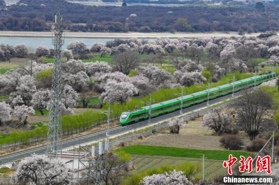 復(fù)興號動車組不僅是一種便捷的交通方式,更成為了一種獨特的旅游體驗,讓游客能夠近距離欣賞到西藏林芝春季獨特的自然美景。圖為穿梭在桃花林中的拉林鐵路高原復(fù)興號。
