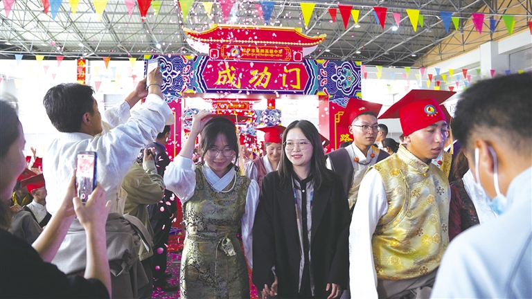 活動(dòng)現(xiàn)場(chǎng),每一位即將畢業(yè)的學(xué)生都要穿過(guò)象征著“成人、成才、成功”的三道門(mén)。家長(zhǎng)代表手捧鮮花,不停地叮囑著孩子;老師們眼眶濕潤(rùn),看著即將離校的學(xué)生,充滿了不舍和期待。此刻,千言萬(wàn)語(yǔ)涌入心間,匯成美好的期盼。