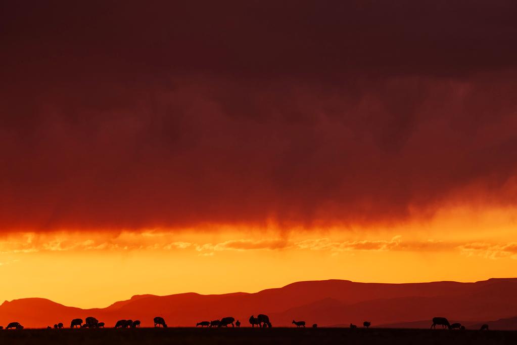 ↑ 在馬賽馬拉國家保護(hù)區(qū),遷徙中的野生動物在夕陽下覓食。
