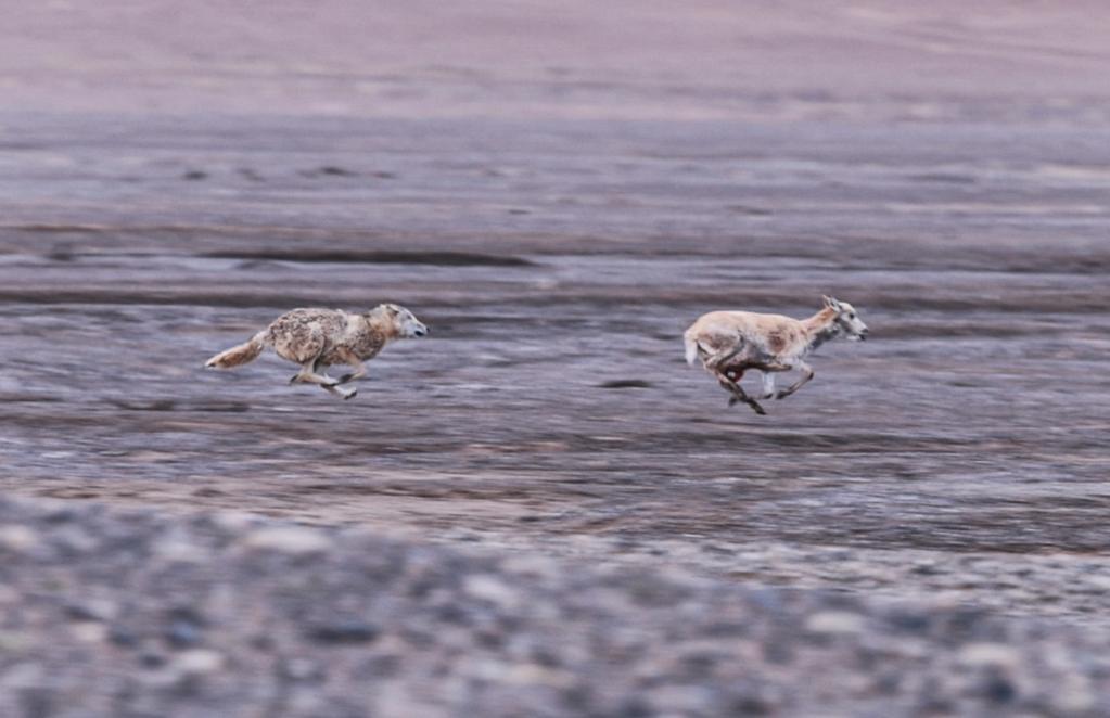 ↑ 在羌塘國家級自然保護(hù)區(qū),一只野狼正在捕食遷徙中的母藏羚羊。在藏羚羊的遷徙過程中,野狼、雪豹、藏馬熊和藏野狐等掠食動物守候在遷徙路上,隨時(shí)準(zhǔn)備捕食。