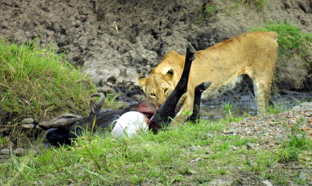 ↑ 在馬賽馬拉國家保護(hù)區(qū),一頭獅子正在享用自己的獵物。