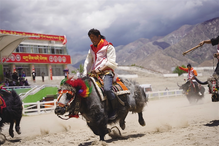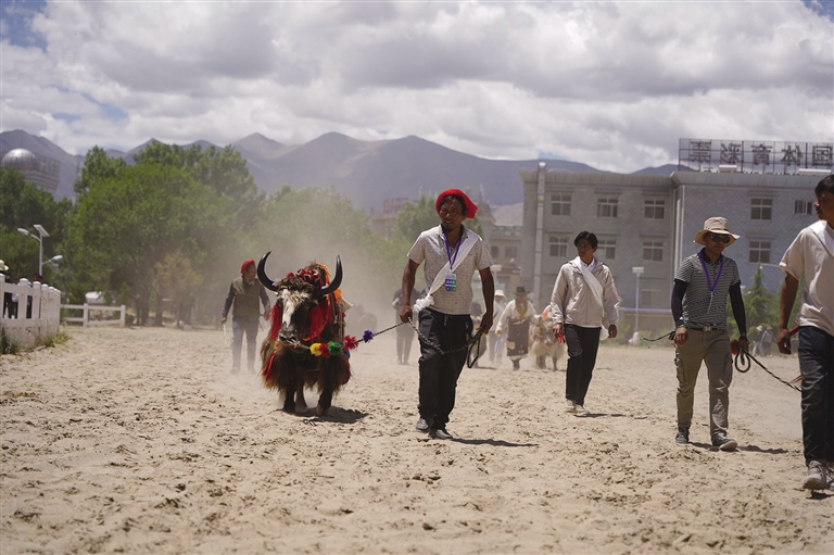 此時(shí),賽場(chǎng)另一邊傳來歡呼,循聲望去,原來是本屆運(yùn)動(dòng)會(huì)的賽牦牛正在進(jìn)行。雖然牦牛生性溫和,但讓它們聽命令奔跑,也并不容易。記者了解到,參加本屆運(yùn)動(dòng)會(huì)的牦牛均由主人精挑細(xì)選,主人一聲吹哨,輕微地蹬腳,牦牛就會(huì)按指令向前行進(jìn),顯得默契十足。但偶爾也會(huì)發(fā)生小狀況,比如牦牛分不清方向擠成一團(tuán),跑著跑著就停頓休息,或者原路返回等,引得觀眾頻頻發(fā)笑。