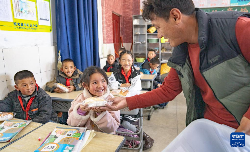 班戈縣中石化小學(xué)后勤副校長(zhǎng)尼旦為學(xué)生們分發(fā)營(yíng)養(yǎng)餐(6月22日攝)。新華社記者 丁增尼達(dá) 攝