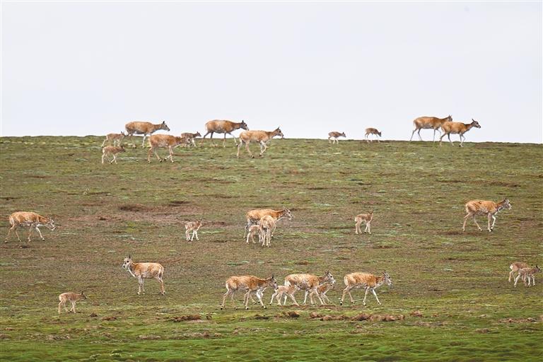 圖為7月8日,在可可西里卓乃湖區(qū)域,一群藏羚羊在活動(dòng)。新華社記者 張龍 攝