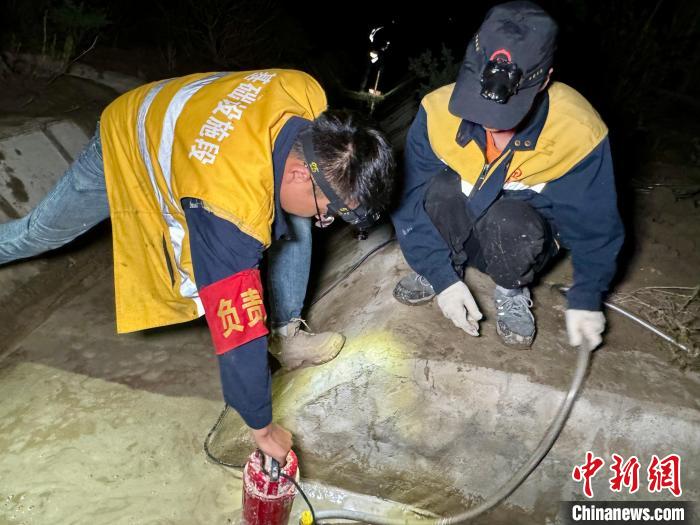 如墨的夜色下,經(jīng)過2個小時的連續(xù)抽水,排水溝的大部分積水被抽出,職工們頭戴照明燈,手握鐵鍬一字擺開,開始深一腳淺一腳,清理溝底淤泥,道道搖曳不定的光柱,在靜默的夜空下閃爍交織。