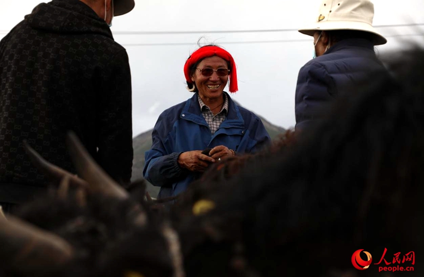 圖為當(dāng)雄縣郭慶村排隊(duì)領(lǐng)取牦牛的村民。人民網(wǎng)記者 次仁羅布攝