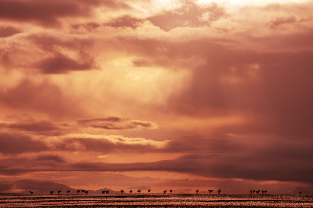 2024年6月15日清晨雪后,在西藏羌塘國(guó)家級(jí)自然保護(hù)區(qū),一群藏羚羊迎著朝霞前行在遷徙路上。
