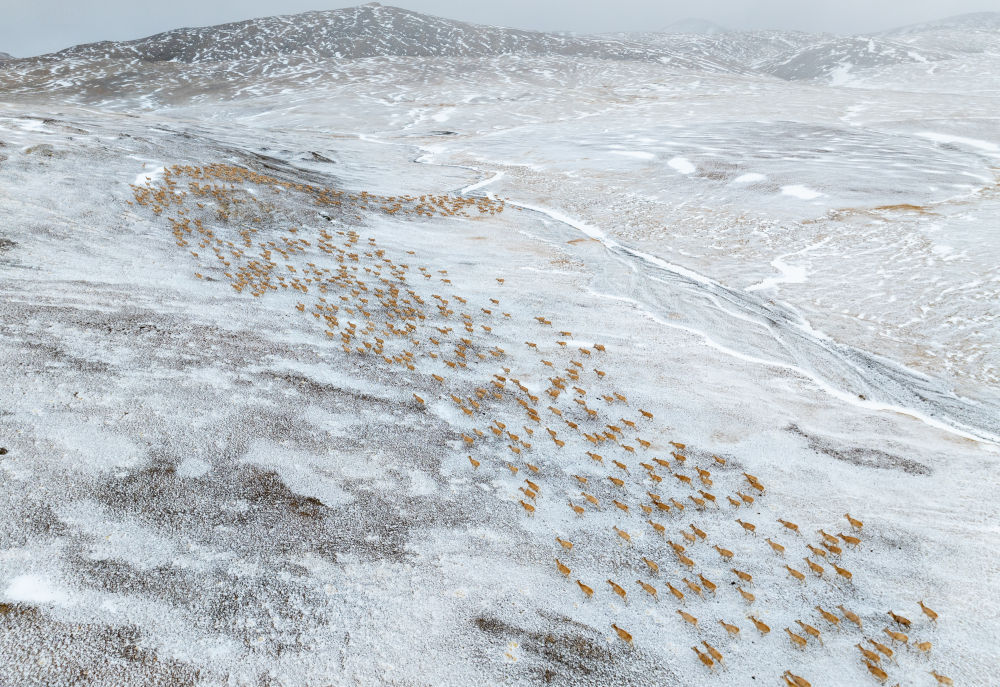 2024年5月10日,在西藏羌塘國(guó)家級(jí)保護(hù)區(qū),藏羚羊在向產(chǎn)羔地遷徙(無(wú)人機(jī)照片)。